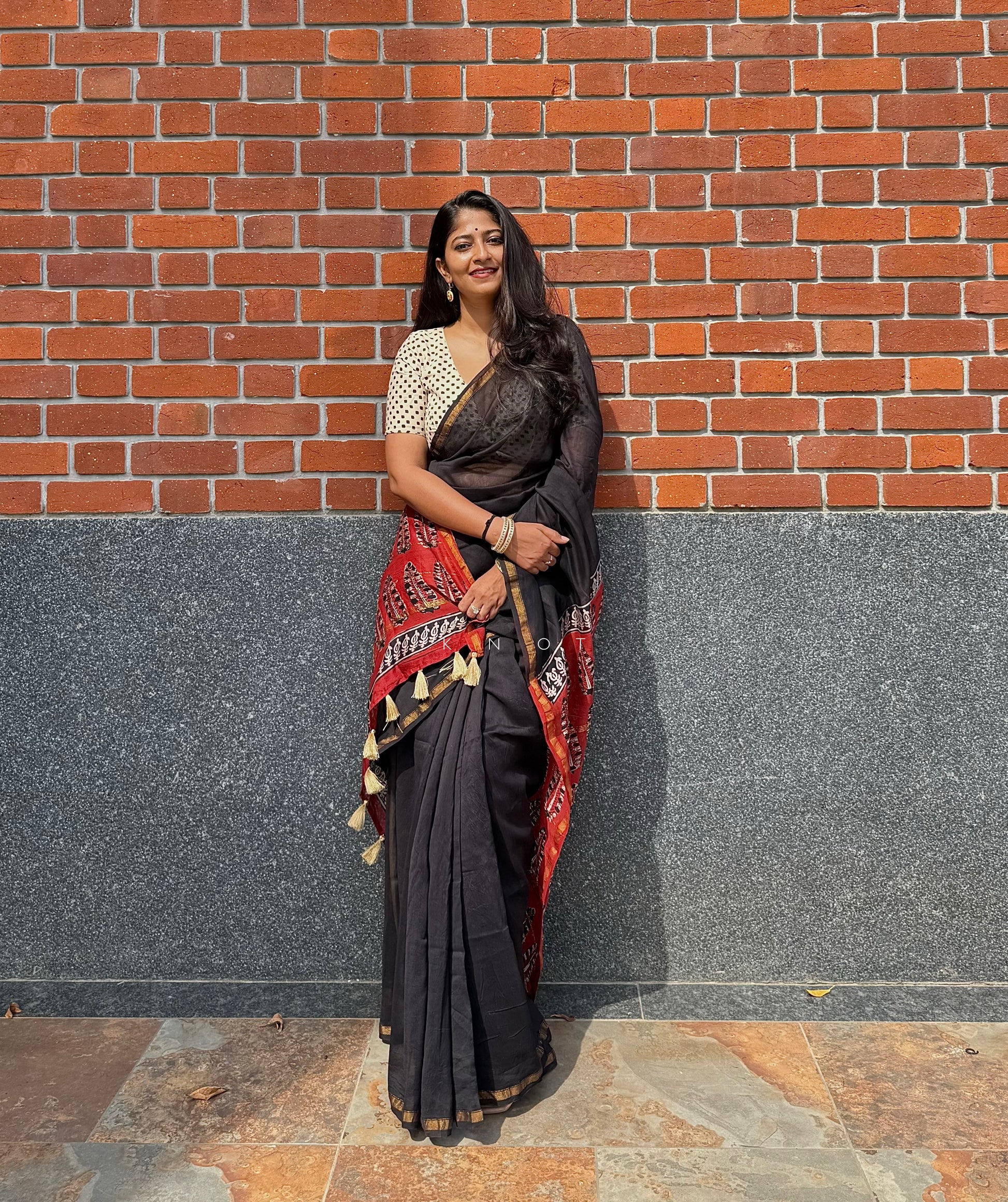 Hand block printed chanderi silk saree adorned with yarn tassels on palla .