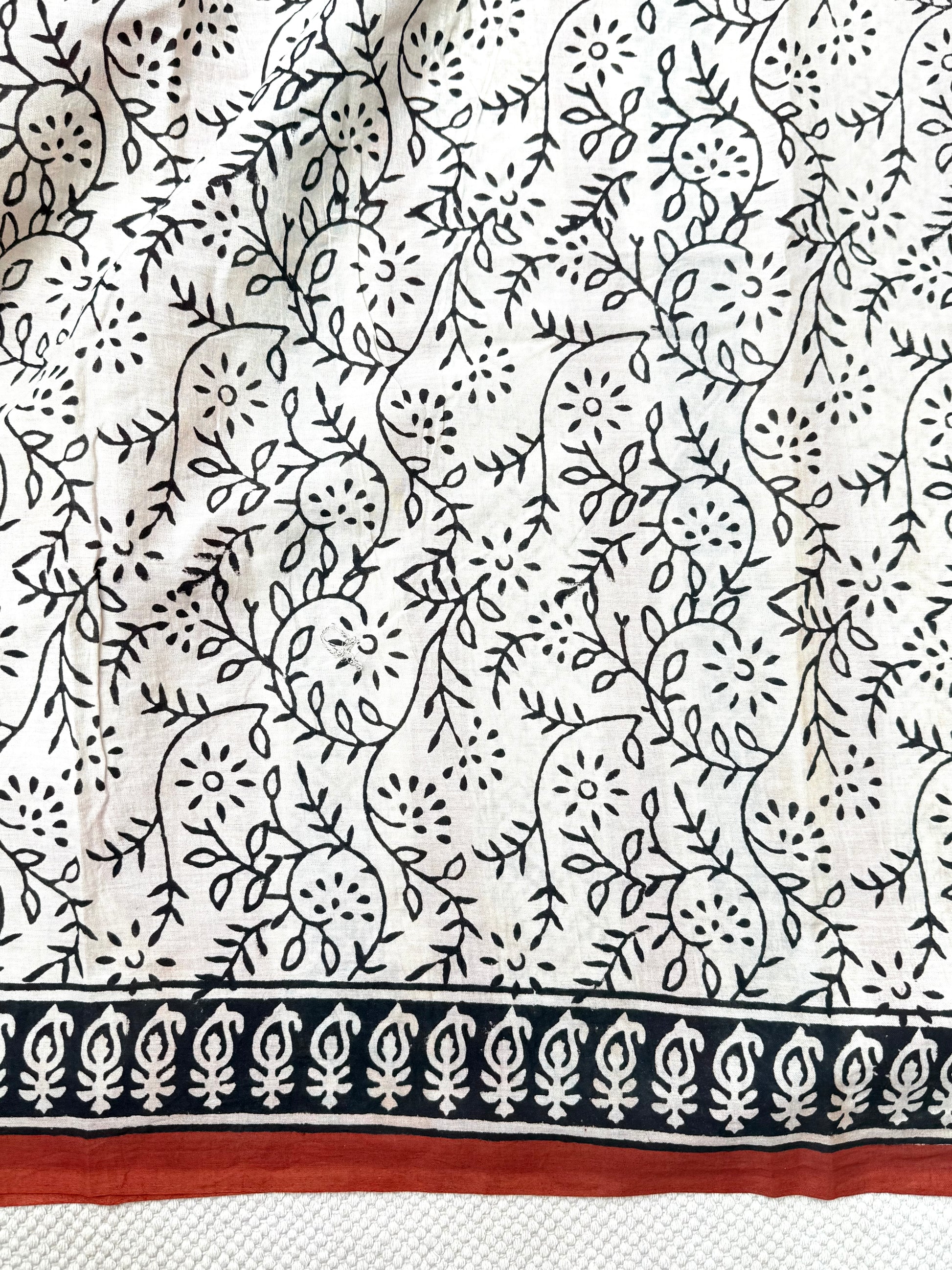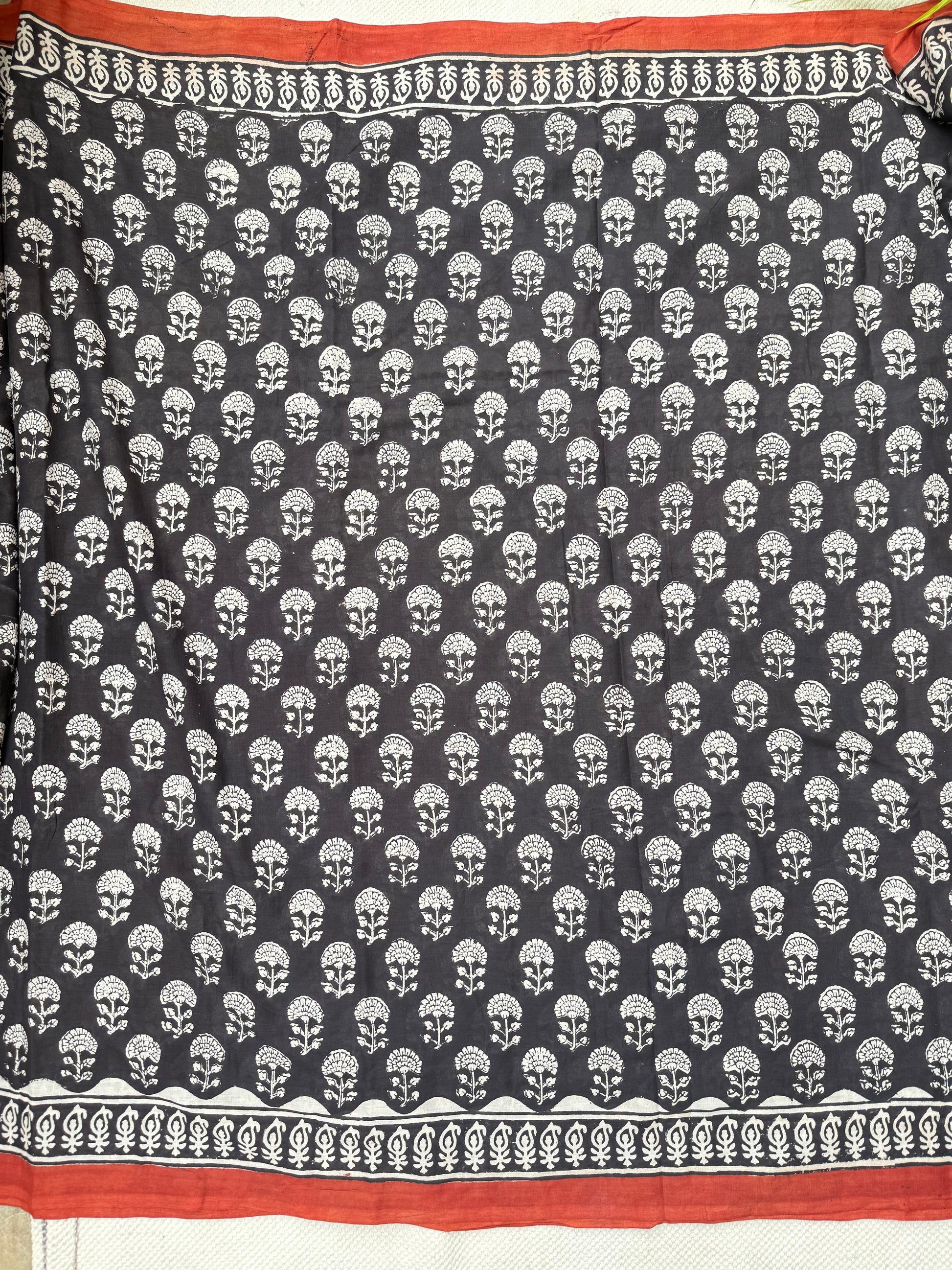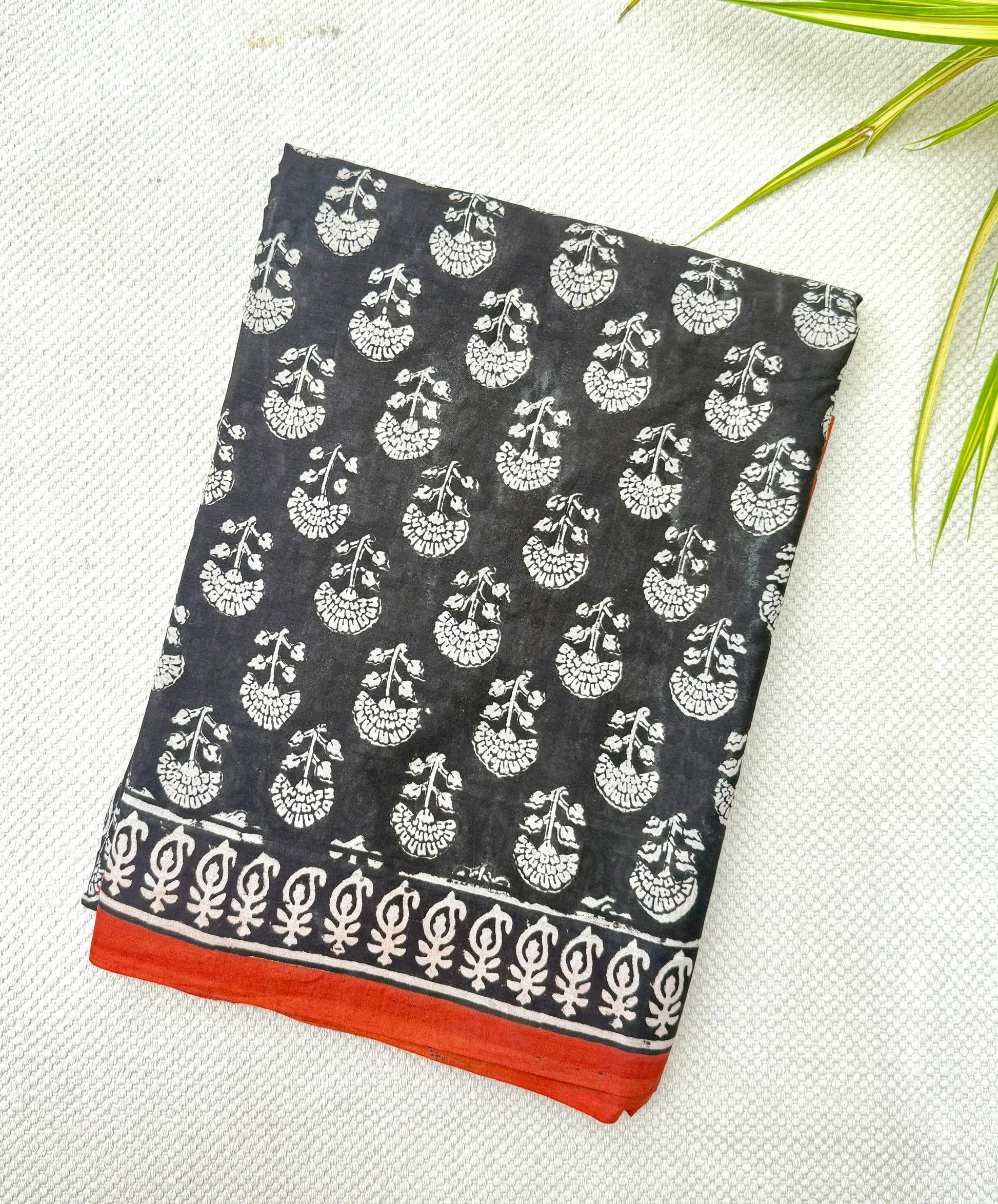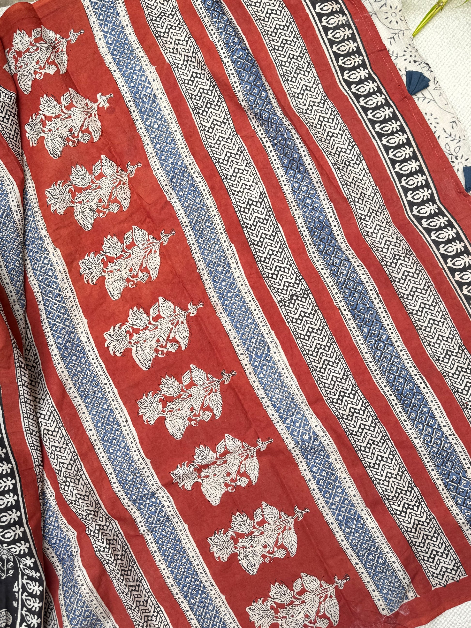 Hand block printed soft mul cotton saree adorned with tassels on palla .